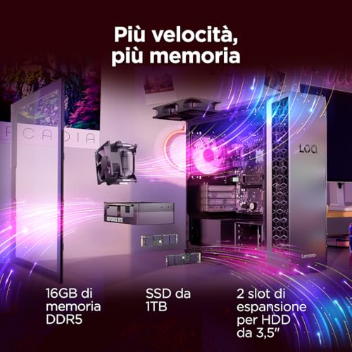 Un punto di forza notevole per un pre-assemblato è la sua facilità di aggiornamento. Lenovo ha progettato lo chassis per essere "tool-less", ovvero apribile senza bisogno di attrezzi, facilitando l'accesso ai componenti interni. Questo significa che in futuro sarà semplice aggiungere più RAM (fino a 64GB), espandere lo storage con un secondo SSD M.2 o dischi tradizionali, e persino sostituire la scheda grafica, garantendo così una notevole longevità alla macchina.