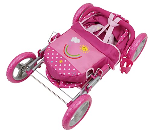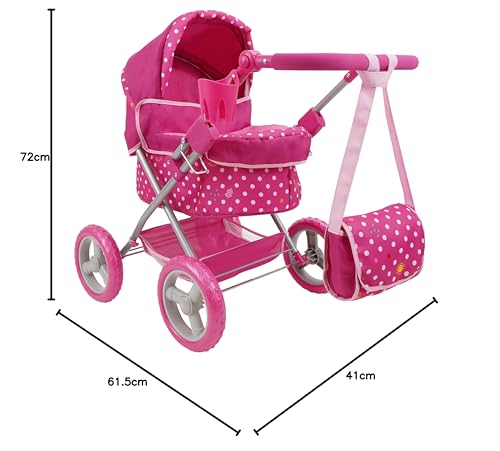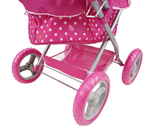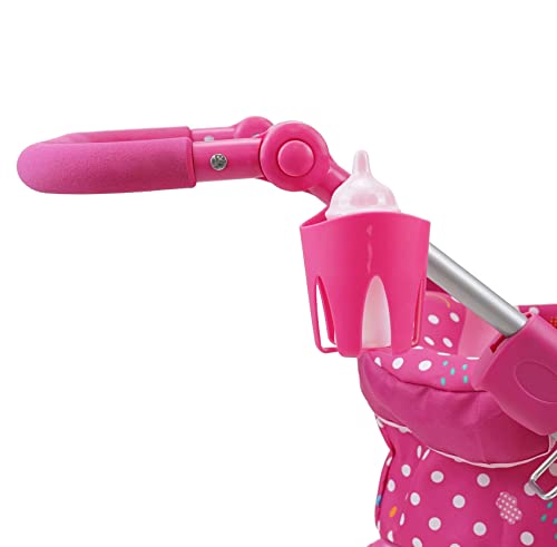 Il pezzo forte del set è senza dubbio la carrozzina. Ispirata ai modelli classici, presenta una struttura solida e caratteristiche interessanti. Le ruote grandi da 19 cm, bicolore e realizzate in EVA, garantiscono una buona stabilità su diverse superfici, rendendola adatta sia per giocare in casa che per brevi passeggiate in giardino. Il maniglione, regolabile in altezza, è rivestito in una comoda schiuma che offre una presa sicura anche per le manine più piccole. La capote è ampia e regolabile, e sotto la seduta trova posto un pratico cestello portaoggetti, proprio come nei passeggini veri! Un dettaglio importante è che la carrozzina è pensata per ospitare bambole fino a 46 cm di altezza. Attenzione, però: la bambola non è inclusa nella confezione.