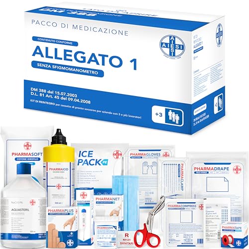 È importante sottolineare che questo specifico kit è la versione SENZA SFIGMOMANOMETRO. La normativa dell'Allegato 1 prevede anche la presenza di un apparecchio per la misurazione della pressione arteriosa. Pertanto, le aziende che non ne fossero già in possesso dovranno acquistarlo separatamente per essere pienamente conformi.