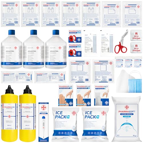 - Soluzioni per la pulizia e disinfezione: 3 flaconi di soluzione fisiologica sterile da 500 ml e 2 flaconi di disinfettante a base di iodopovidone al 10% da 500 ml. Fondamentali per la detersione e l'antisepsi delle ferite.