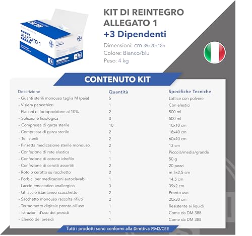 In conclusione, il kit di reintegro AIESI® ALLEGATO 1 SENZA SFIGMOMANOMETRO è un prodotto altamente raccomandato per tutte le aziende con tre o più dipendenti che necessitano di aggiornare la propria cassetta di primo soccorso. La sua completezza, la conformità alle normative italiane ed europee e la praticità d'uso lo rendono una scelta eccellente. Il fatto che sia "Made in Italy" è un ulteriore punto a favore. L'unica vera pecca, se così si può definire, è l'assenza dello sfigmomanometro, una mancanza chiaramente indicata nel nome del prodotto ma che richiede un acquisto supplementare per chi non ne fosse già provvisto. Nel complesso, rappresenta una soluzione efficiente ed economica per garantire la sicurezza e la tranquillità sul posto di lavoro.