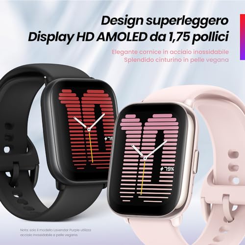 Appena tolto dalla confezione, l'Amazfit Active colpisce per il suo design minimalista e curato. Con dimensioni di 42,36 x 35,9 x 10,75 mm e un peso piuma di soli 24 grammi (senza cinturino), è uno di quegli smartwatch che ti dimentichi di avere al polso, sia di giorno che di notte. La cassa, disponibile in diverse colorazioni tra cui Midnight Black e Petal Pink, è realizzata in lega di alluminio, che conferisce un tocco premium al dispositivo. La versione Lavender Purple si distingue per una cassa in acciaio inossidabile e un cinturino in pelle vegana.