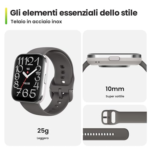 A primo impatto, l'Amazfit Bip 5 Unity sorprende. Abbandonata la plastica del suo predecessore, questo modello sfoggia una struttura in acciaio inossidabile che gli conferisce un aspetto decisamente più premium ed elegante. Nonostante questo upgrade nei materiali, riesce a mantenersi incredibilmente leggero, con un peso di appena 25 grammi (escluso il cinturino), e sottile, con uno spessore di 10 mm. Questo lo rende estremamente comodo da indossare 24 ore su 24, quasi dimenticandosi di averlo al polso. Il design è pulito, essenziale e versatile, adatto sia a un contesto sportivo che a uno più formale. È disponibile in diverse colorazioni, tra cui Grigio, Charcoal e Rosa, per adattarsi a ogni stile.