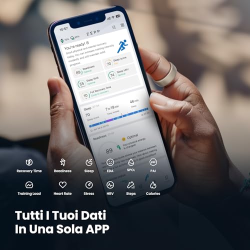 L'anello è anche un ottimo compagno per il fitness. Sebbene non sia pensato per sostituire uno sportwatch, è in grado di tracciare le attività e, se usato in sinergia con uno smartwatch Amazfit, può arricchire i dati dell'allenamento con informazioni sul recupero. Inoltre, è impermeabile fino a 10 ATM, quindi può essere indossato senza problemi per nuotare o fare la doccia.