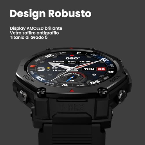 A proteggere il cuore tecnologico del T-Rex Ultra troviamo un display AMOLED da 1,39 pollici con una risoluzione di 454x454 pixel. La qualità è eccellente, con neri profondi e colori vividi, ma il vero punto di forza è la luminosità. Con un picco di 1.000 nit, lo schermo rimane perfettamente leggibile in ogni condizione di luce, anche sotto il sole diretto di mezzogiorno. Questo è fondamentale per un orologio pensato per l'outdoor, dove la visibilità è tutto. La navigazione tramite touchscreen è fluida e reattiva, affiancata sempre dalla comodità dei tasti fisici per le situazioni più complicate.