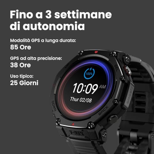 Con oltre 160 modalità sportive, il T-Rex Ultra copre praticamente qualsiasi attività ti venga in mente, dal paracadutismo all'apnea, passando per il triathlon e l'allenamento della forza in palestra. L'orologio è anche in grado di riconoscere automaticamente 8 tipi di sport e 25 esercizi di forza, registrando serie, ripetizioni e tempi di riposo.