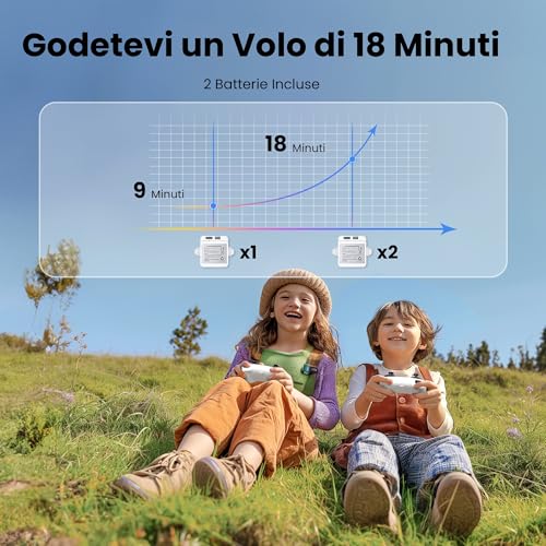 - Dotazione completa con due batterie per un totale di 18 minuti di volo