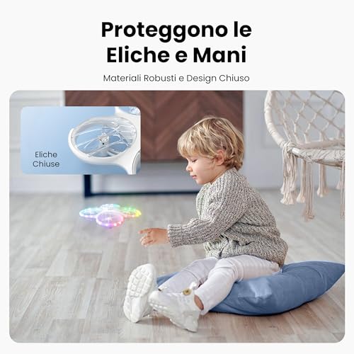 La sicurezza è chiaramente una priorità. I paraeliche fissi proteggono efficacemente sia le eliche da urti contro muri e ostacoli, sia le dita dei bambini. Inoltre, è presente una funzione di "Cicalino Perso": se il drone finisce fuori dal raggio di controllo o si perde di vista, un segnale acustico aiuta a ritrovarlo. Un'accortezza davvero utile, soprattutto quando si gioca all'aperto.