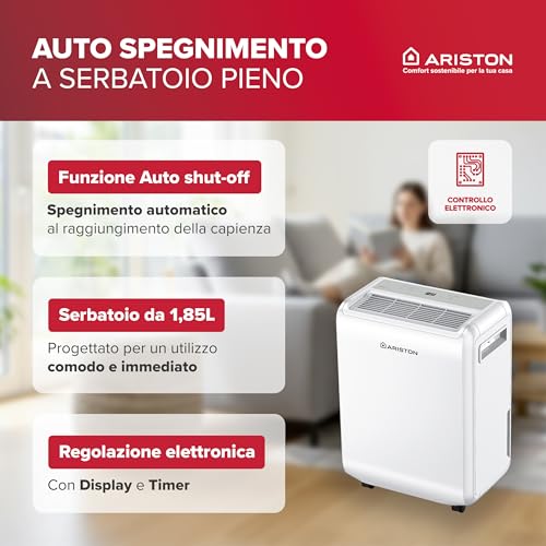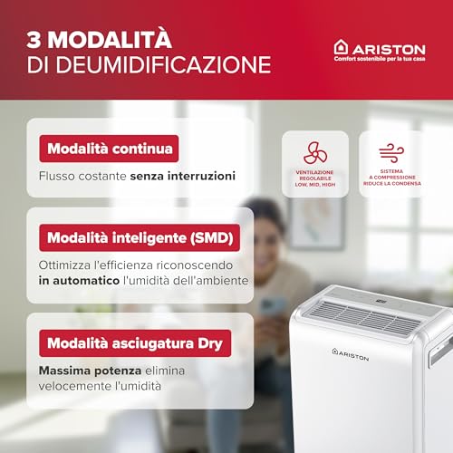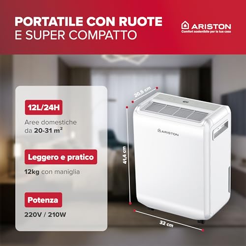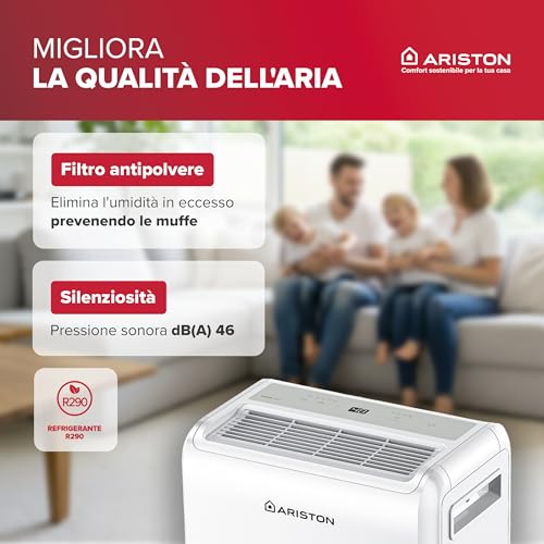 L'umidità in casa può essere un problema serio, causando non solo danni a muri e arredi con la formazione di muffe, ma anche potenziali rischi per la salute. L'Ariston DEOS 12 si propone come una soluzione efficace e compatta per mantenere il giusto livello di umidità negli ambienti domestici. Questo deumidificatore portatile è progettato per essere pratico e facile da usare, adatto a chi cerca un dispositivo funzionale senza troppe complicazioni.