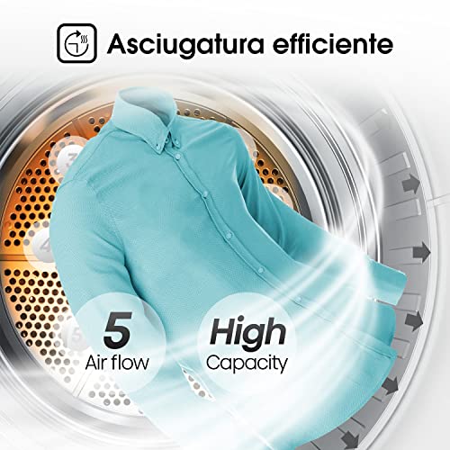- Auto Dry e Sensori di Umidità: Basta con i capi troppo secchi o, peggio, ancora umidi! Grazie a sensori di alta precisione, l'asciugatrice monitora costantemente il livello di umidità e la temperatura, regolando automaticamente la durata del ciclo. Questo non solo protegge i tessuti da un calore eccessivo ma ottimizza anche tempo ed energia.
