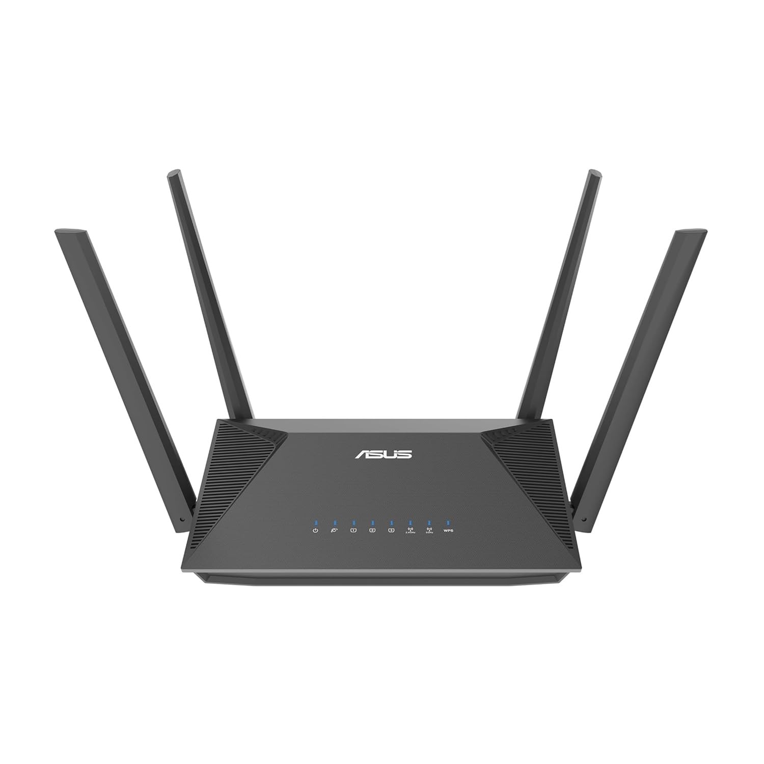 Al primo sguardo, l'ASUS RT-AX57 si presenta con un design sobrio e funzionale. La scocca nera, impreziosita da due sottili strisce dorate, è pensata per essere posizionata su una superficie piana, ma grazie a due fori sul fondo può anche essere montata a parete. Le quattro antenne esterne non sono rimovibili, un dettaglio da considerare in base allo spazio a disposizione. Sulla parte frontale, cinque LED di stato forniscono indicazioni immediate su alimentazione, attività delle bande a 2.4GHz e 5GHz, e connessioni LAN e WAN.