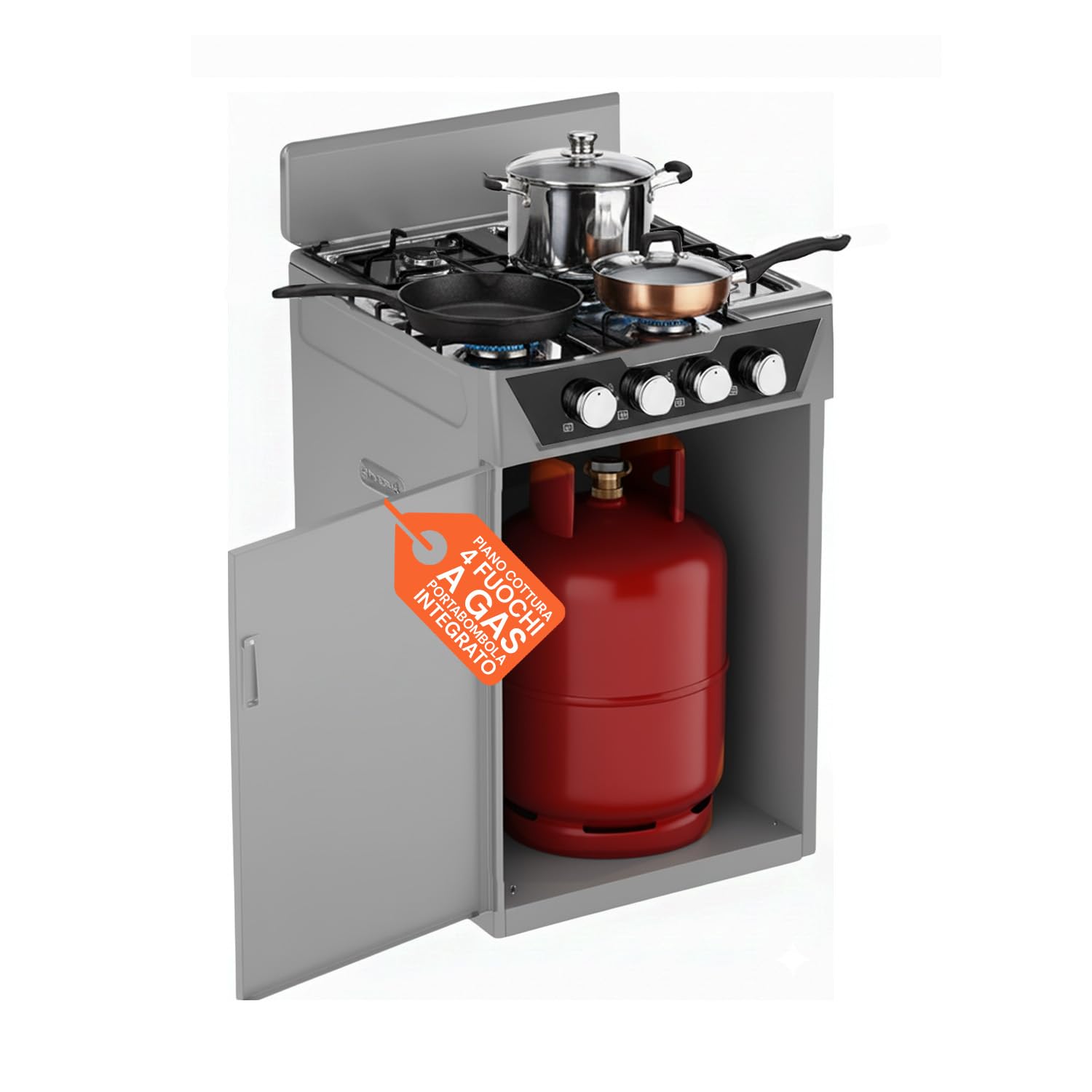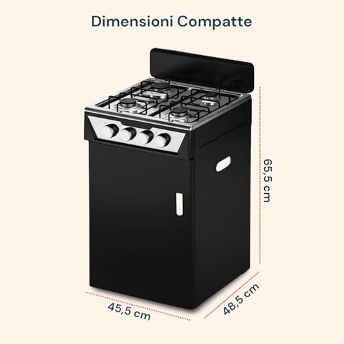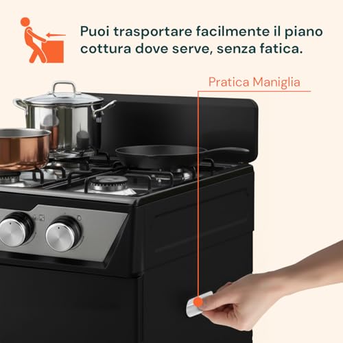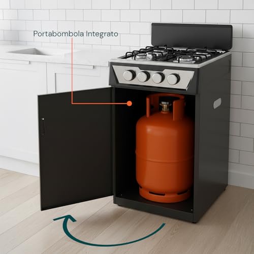 La vera chicca di questo piano cottura è senza dubbio il vano portabombola integrato. Questa caratteristica lo rende una soluzione "tutto in uno" estremamente comoda. Lo spazio è sufficientemente ampio per alloggiare una bombola di gas GPL standard, nascondendola alla vista e rendendo l'intera struttura più ordinata e sicura. L'installazione della bombola è semplice e non richiede particolari competenze tecniche, basta seguire le istruzioni fornite.