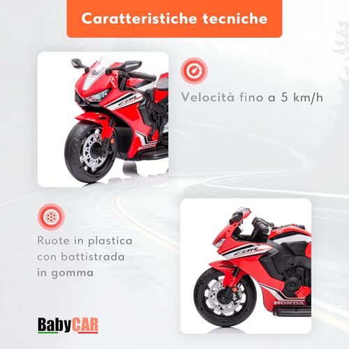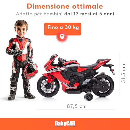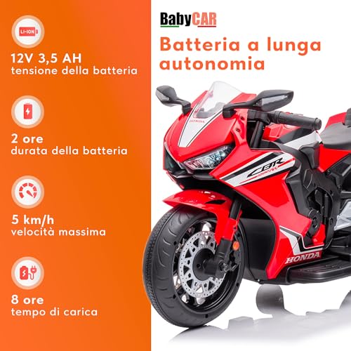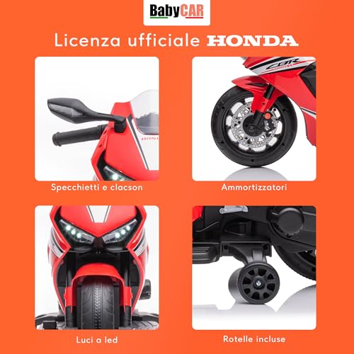 La Babycar Honda CBR 12V non è una semplice moto giocattolo, ma una vera e propria riproduzione in scala della celebre moto sportiva giapponese, realizzata su licenza ufficiale Honda. Questo significa che ogni dettaglio, dalle linee aggressive della carena agli adesivi, è stato pensato per replicare fedelmente il modello originale, regalando ai piccoli piloti un'esperienza incredibilmente realistica e coinvolgente. Appena la si vede, si capisce subito che non si tratta di un prodotto generico: il design è grintoso e cattura immediatamente l'attenzione dei bambini (e anche dei genitori!).