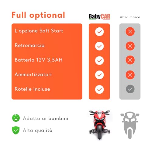 La Babycar Moto Elettrica Honda CBR 12V è un prodotto di ottima fattura, che unisce un design realistico e accattivante a caratteristiche tecniche pensate per il divertimento in sicurezza dei più piccoli. La licenza ufficiale Honda è una garanzia di qualità e fedeltà estetica, mentre dettagli come la partenza Soft Start, le luci a LED, i suoni e l'ingresso MP3 la rendono un giocattolo completo e desiderabile. Sebbene l'autonomia della batteria sia standard, è sufficiente per garantire lunghe sessioni di gioco. È il regalo perfetto per i piccoli appassionati di motori, un sogno ad occhi aperti che li farà sentire dei veri piloti.