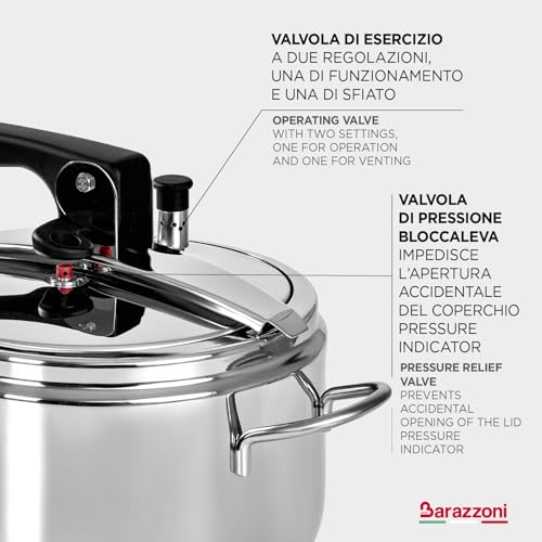 Quando si parla di pentole a pressione, la sicurezza è un aspetto non negoziabile. La Barazzoni Basic è dotata di diversi sistemi di sicurezza che la rendono affidabile. Il principale è il Blocca leva, un meccanismo che impedisce l'apertura del coperchio anche in presenza di una minima pressione interna. A questo si aggiunge la classica valvola di sicurezza, che entra in funzione nel caso in cui la valvola di esercizio si ostruisca, rilasciando il vapore in eccesso.