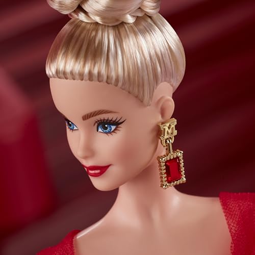 Osservando da vicino, si apprezzano i dettagli che distinguono questa Barbie da una normale bambola playline. Il viso, con la variante bionda del modello JBJ17, presenta un make-up elegante con labbra rosse decise che richiamano il colore dell'abito. I capelli biondi sono raccolti in un'acconciatura sofisticata, un updo curato che lascia scoperte alcune ciocche a incorniciare il viso, aggiungendo un tocco di classe senza tempo.