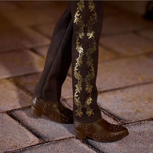 Anche la bambola Ken è un capolavoro di dettagli. Il suo abito si ispira alla figura del "charro", ma con un'interpretazione moderna e sofisticata. Indossa una camicia color crema ricamata con dettagli che richiamano i fiori di cempasúchil, abbinata a un gilet e pantaloni neri con ricchi accenti dorati. Il look è completato da un sombrero finemente decorato, una cintura personalizzata e stivali che riprendono i motivi dorati.
