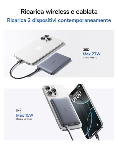 - Ricarica Cablata USB-C PD a 27W: Se hai fretta, la porta USB-C è la tua migliore amica. Con una potenza di uscita fino a 27W, permette di ricaricare l'iPhone (e altri dispositivi compatibili) a una velocità notevolmente superiore.