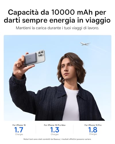 Con una capacità di 10000mAh, il Baseus Qi2 PowerBank è in grado di fornire circa 1.7-1.8 ricariche complete per un iPhone recente. Questo lo rende un compagno ideale per lunghe giornate fuori casa, viaggi o situazioni in cui non si ha accesso a una presa di corrente. La possibilità di ricaricare completamente il proprio smartphone e avere ancora energia residua offre una grande tranquillità.