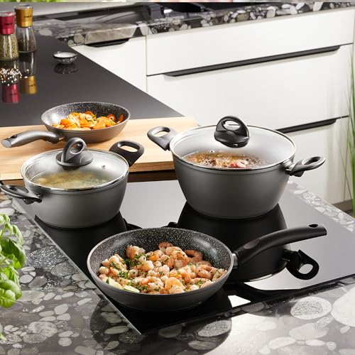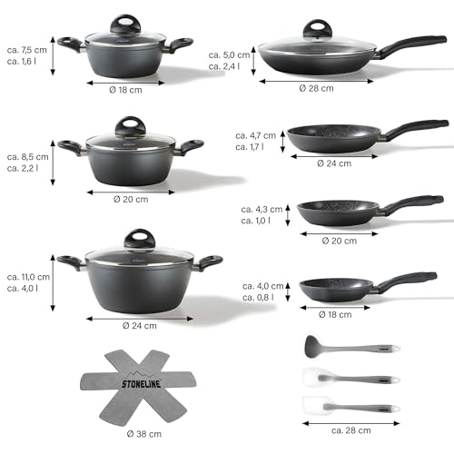 STONELINE offre una vasta gamma di set, da quelli più piccoli da 6 pezzi, ideali per chi ha poco spazio o per un single, fino a batterie complete da 14 o 16 pezzi che soddisfano le esigenze di una famiglia numerosa. I set più grandi includono tipicamente una varietà di pentole, casseruole di diverse dimensioni, padelle e, in alcuni casi, accessori utili come i proteggi padelle in feltro. La scelta dipende esclusivamente dalle proprie abitudini in cucina e dalle necessità personali.