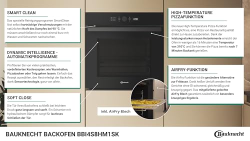 Oltre a queste modalità innovative, il Bauknecht BBI4S8HM1SK offre ovviamente tutte le funzioni classiche che ci si aspetta da un forno moderno: statico, ventilato, grill, turbo grill, lievitazione impasti e mantenimento in caldo. È presente anche la funzione Gentle Steam, che aggiunge un tocco di vapore durante la cottura per rendere arrosti e pane ancora più succosi e morbidi.
