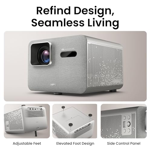 Appena tolto dalla scatola, il BenQ TK705i si presenta con un design compatto ed elegante, più ricercato rispetto ad altri modelli del marchio. La finitura bianca è interrotta da un pannello frontale in tessuto grigio che gli conferisce un aspetto moderno, capace di integrarsi bene in qualsiasi salotto. Sul lato destro troviamo i comandi manuali, utili se non si ha il telecomando a portata di mano, mentre sul retro si concentra il parco connessioni.