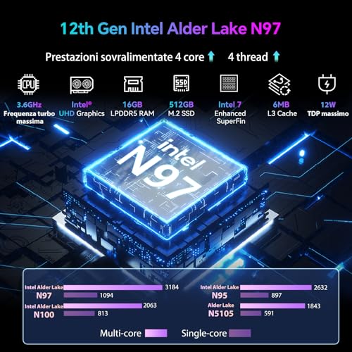 Il cuore pulsante di questo piccolo gigante è il processore Intel Alder Lake N97 di 12a generazione, un quad-core che può raggiungere i 3.6 GHz in modalità turbo. Sebbene faccia parte della fascia bassa di Intel, non bisogna lasciarsi ingannare: questo chip è più che adeguato per le attività di ufficio e la produttività quotidiana. La vera marcia in più, però, è data dai 16 GB di RAM LPDDR5. Questa memoria, molto più veloce della precedente generazione DDR4, permette al sistema di essere scattante e reattivo, gestendo senza problemi anche un numero elevato di schede aperte nel browser o diverse applicazioni in multitasking.