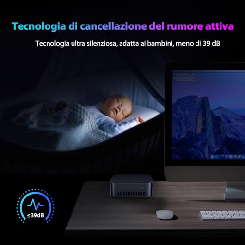 Un altro punto a suo favore è il sistema di raffreddamento. Nonostante le dimensioni compatte, il mini PC integra una ventola che svolge un ottimo lavoro nel mantenere le temperature sotto controllo, anche sotto carico. La tecnologia di cancellazione attiva del rumore fa sì che il dispositivo rimanga piacevolmente silenzioso durante l'uso normale, un vantaggio non da poco per chi cerca un ambiente di lavoro tranquillo.