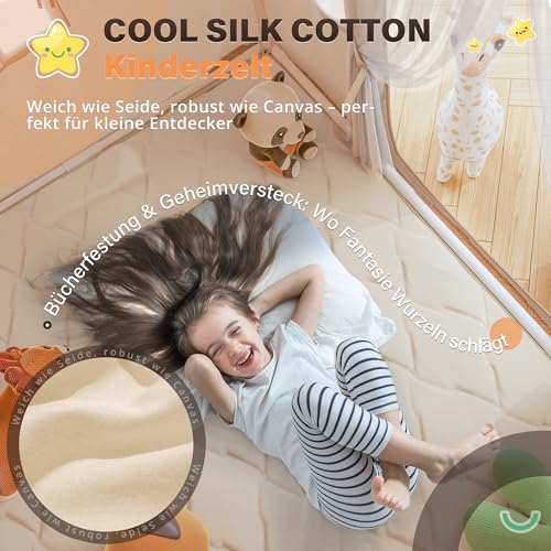 Come accennato, la tenda è realizzata in tessuto di cotone traspirante. Questo è un punto a favore molto importante, perché garantisce una buona circolazione dell'aria all'interno, evitando che diventi troppo calda. Il design è semplice ma efficace: sul lato è presente una piccola finestra, che permette ai genitori di dare un'occhiata all'interno e ai bambini di sentirsi in un vero piccolo rifugio senza essere completamente isolati. La base misura circa 120 x 120 cm, mentre l'altezza raggiunge i 150 cm, uno spazio sufficiente per ospitare comodamente due bambini piccoli con i loro giochi o libri. La pavimentazione è pensata per essere antiscivolo, un ulteriore accorgimento per la sicurezza.
