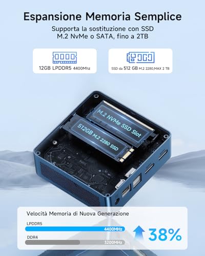 Un punto a favore del B4 Ultra è la facilità di accesso ai componenti interni e le possibilità di espansione. Oltre all'SSD M.2 preinstallato, è possibile aggiungere un secondo hard disk o SSD da 2.5 pollici, un'opzione sempre più rara nei mini PC moderni e molto apprezzata per chi necessita di più spazio di archiviazione. L'aggiornamento dell'SSD M.2 principale è possibile fino a 2TB.