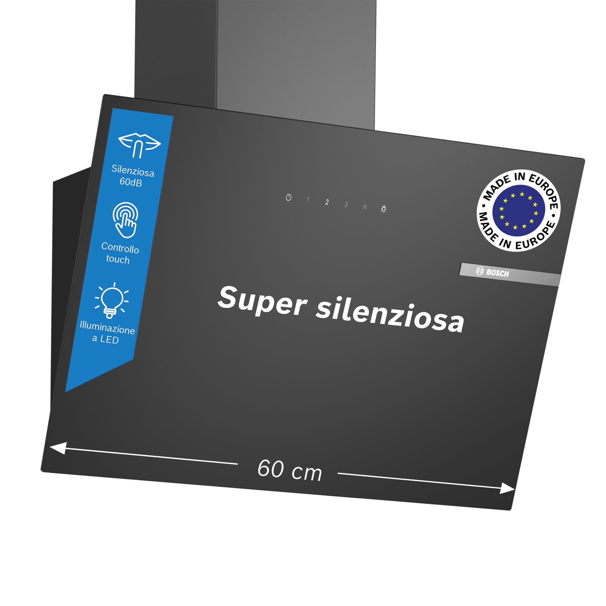 Il cuore di questa cappa è il suo motore, che Bosch descrive come estremamente silenzioso. La potenza di aspirazione massima in modalità normale è di 430 m³/h, che sale a 550 m³/h con la funzione intensiva. Quest'ultima è particolarmente utile per eliminare rapidamente odori forti e fumi intensi, con il vantaggio di un reset automatico che riporta la cappa alla velocità normale dopo alcuni minuti, ottimizzando i consumi.