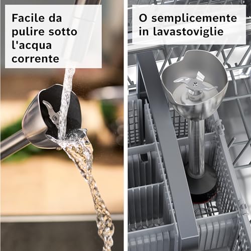 Il meccanismo a click per agganciare e sganciare il piede e gli altri accessori è semplice e sicuro. Inoltre, la maggior parte dei componenti (ad eccezione del corpo motore) è lavabile in lavastoviglie, semplificando notevolmente le operazioni di pulizia.