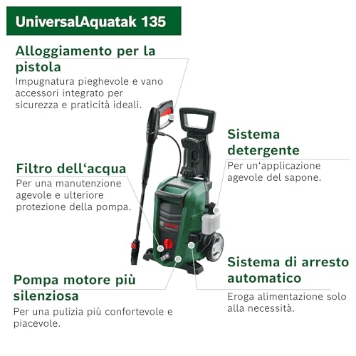 Spesso, chi valuta la UniversalAquatak 135 la confronta con modelli equivalenti di altri marchi noti, come la Kärcher K4. Rispetto a quest'ultima, la Bosch offre una pressione massima leggermente superiore (135 bar contro 130) e un motore più potente (1900W contro 1800W). Di contro, la Kärcher ha una portata d'acqua leggermente maggiore (420 l/h contro 410) e, in alcuni modelli, un motore raffreddato ad acqua, assente nella Bosch. In generale, la Bosch tende ad avere un rapporto qualità-prezzo più aggressivo, offrendo spesso più accessori a parità di costo.