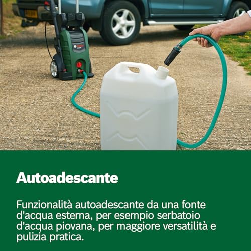 La Bosch UniversalAquatak 135 è stata progettata pensando alla praticità. Ogni componente ha il suo alloggiamento sull'unità principale, mantenendo tutto in ordine. Il tubo ad alta pressione da 7 metri e il cavo di alimentazione da 5 metri offrono un buon raggio d'azione, permettendo di muoversi agevolmente intorno a un'auto o in un giardino di medie dimensioni senza dover spostare continuamente la macchina.