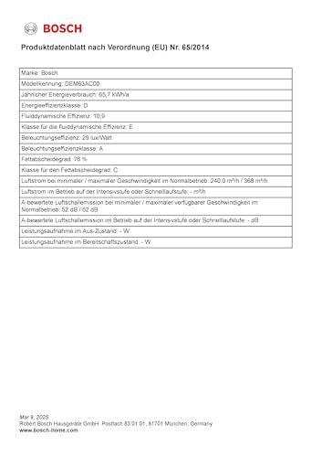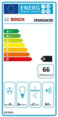 La cappa Bosch Serie 2 DEM63AC00 si colloca in classe di efficienza energetica D, con un consumo annuo stimato intorno ai 65,7 kWh. Sebbene non sia ai vertici della categoria per risparmio energetico, il suo impatto sulla bolletta elettrica rimane contenuto, soprattutto grazie all'illuminazione a LED a basso consumo.