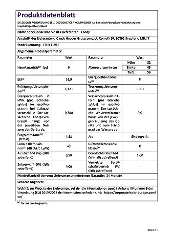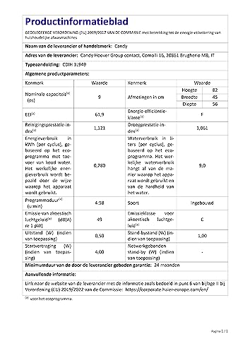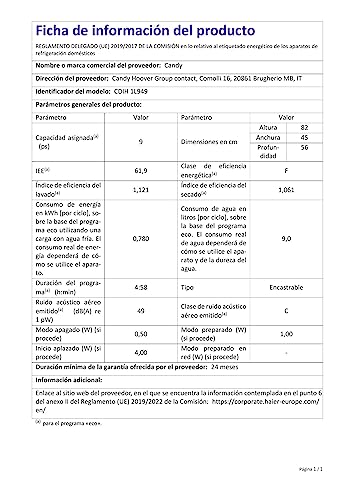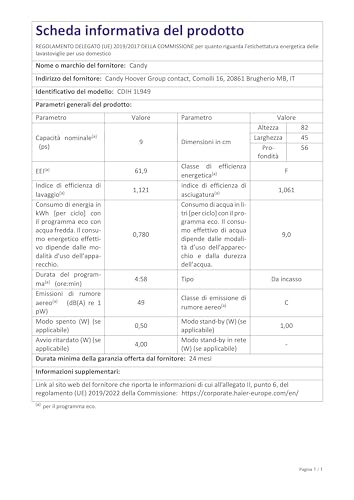 Dal punto di vista energetico, la Candy Brava CDIH 1L949 si posiziona in Classe di Efficienza Energetica F (secondo la nuova etichettatura). Il consumo d'acqua per il ciclo Eco è di 9 litri, un valore abbastanza contenuto, mentre il consumo energetico per 100 cicli si attesta sui 78 kWh. Sebbene non sia un campione di efficienza, i suoi consumi sono in linea con altri prodotti della stessa fascia di mercato e dimensione.