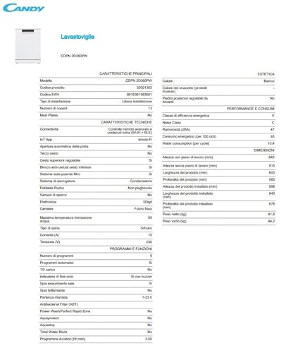 La Candy Brava CDPN 2D360PW si posiziona in Classe di Efficienza Energetica E secondo la nuova etichettatura. Il consumo energetico è di 93 kWh per 100 cicli in modalità Eco, mentre il consumo d'acqua per ciclo è di circa 10,4 litri. Si tratta di valori nella media per la sua categoria, che non la rendono un campione di risparmio ma neanche un elettrodomestico eccessivamente "assetato" di energia e acqua.