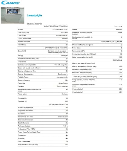 La Candy Brava CELDIMN 4S622PSE è una lavastoviglie a scomparsa totale che colpisce per la sua straordinaria capacità di 16 coperti e per la velocità del suo ciclo rapido da 39 minuti. È un elettrodomestico pensato per semplificare la vita quotidiana, grazie anche alle funzionalità smart che, sebbene non indispensabili per tutti, aggiungono un livello di comodità moderno e apprezzabile. La buona gestione degli spazi interni e la silenziosità sono altri punti a suo favore. La classe energetica C è accettabile, ma non la pone tra le più virtuose del mercato. Nel complesso, è una scelta eccellente per famiglie numerose o per chi cerca una lavastoviglie capiente, veloce e tecnologicamente al passo con i tempi.