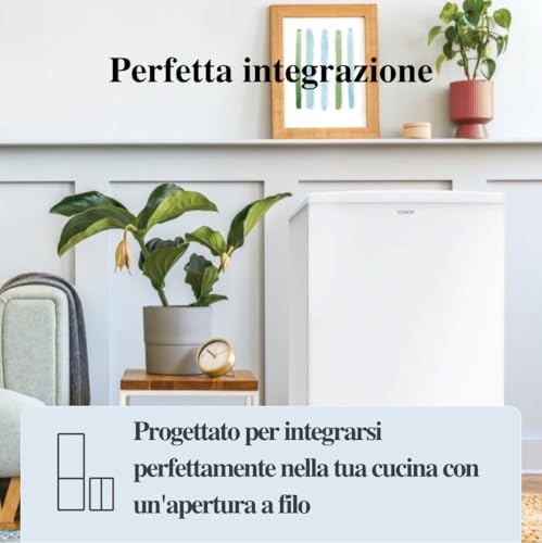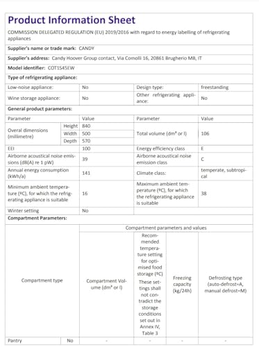 Dal punto di vista dell'efficienza, il Candy Comfort COT1S45EW si colloca in classe energetica E secondo la nuova etichettatura europea. Il consumo energetico annuo dichiarato è di 141 kWh, un valore che, sebbene non da primo della classe, risulta contenuto e permette di risparmiare energia rispetto a modelli di classe inferiore. La scelta di un'illuminazione interna a LED contribuisce a mantenere bassi i consumi e garantisce un'ottima visibilità all'interno del vano frigo.