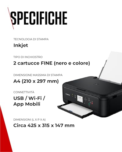 La Canon TS5150 utilizza le cartucce PG-540 (nero) e CL-541 (colore). Sono disponibili sia in formato standard che in versione XL ad alta capacità, che consentono di stampare un numero maggiore di pagine e risultano più convenienti sul lungo periodo. Il sistema a due cartucce è semplice da gestire, ma presenta lo svantaggio che, se uno dei tre colori nella cartuccia tricromia si esaurisce, è necessario sostituire l'intera cartuccia anche se gli altri colori non sono terminati. Questo potrebbe portare a un leggero spreco d'inchiostro. Per chi cerca un ulteriore risparmio, sono disponibili in commercio anche cartucce compatibili o rigenerate, che offrono un'alternativa economica a quelle originali.