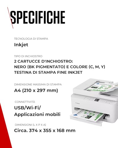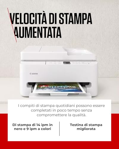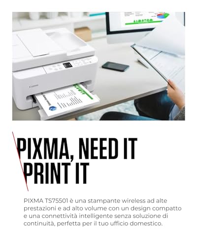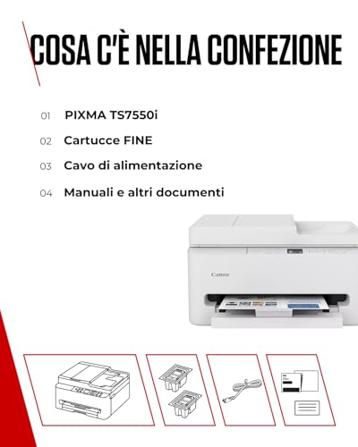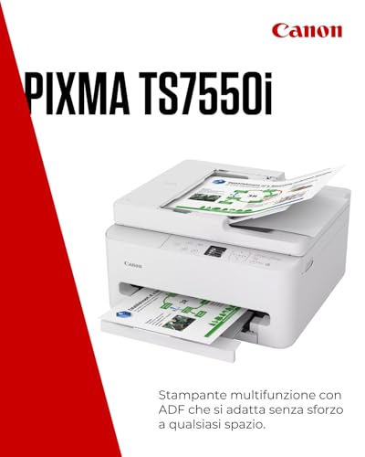 La Canon PIXMA TS7550I si presenta come una soluzione 3-in-1 (stampa, copia, scansione) pensata per un utilizzo domestico o per piccoli uffici. Il suo design è elegante e compatto, con dimensioni di circa 374 x 355 x 208 mm a vassoi chiusi, il che la rende facile da collocare anche in spazi ristretti. Una delle sue caratteristiche più apprezzate è l'Alimentatore Automatico di Documenti (ADF) da 35 fogli, che semplifica enormemente le operazioni di copia e scansione di documenti multipagina, un vero toccasana per la produttività.