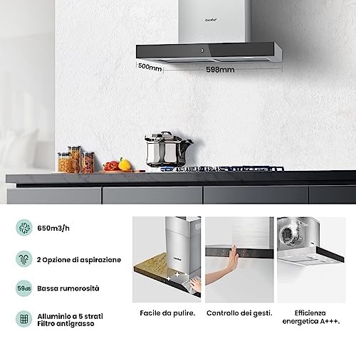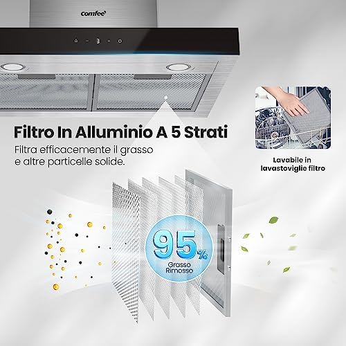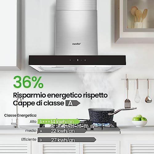 Il vero punto di forza di questa cappa COMFEE' è il suo motore BLDC (Brushless Direct Current). Questa tecnologia, rispetto ai motori tradizionali, garantisce una maggiore potenza di aspirazione a fronte di un consumo energetico notevolmente ridotto. Non a caso, questo modello vanta una classe di efficienza energetica A+++, un traguardo eccellente che si traduce in un risparmio tangibile sulla bolletta elettrica, con un consumo medio annuo dichiarato di soli 17 kWh. Un bel vantaggio, considerando quanto spesso la cappa resta accesa mentre si cucina.