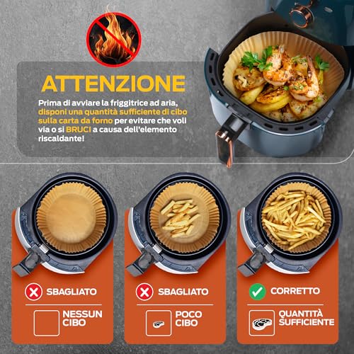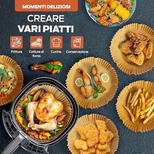 - Rotonda (16-20 cm): perfetta per le classiche friggitrici a cestello singolo da 3,5 a 6 litri.