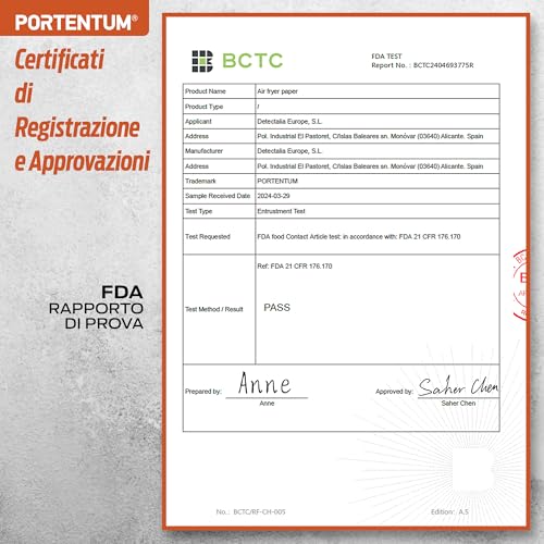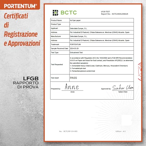 Quando si parla di accessori che vanno a contatto con il cibo e sottoposti ad alte temperature, la sicurezza è la priorità assoluta. PORTENTUM lo sa bene, e per questo la sua carta forno vanta certificazioni importanti come BPA Free, FDA e LFGB. Ma cosa significano queste sigle? In parole semplici, garantiscono che la carta è realizzata con materiali atossici, sicuri per l'uso alimentare e che non rilasciano sostanze nocive durante la cottura. Si tratta di pergamena per uso alimentare, resistente al calore (fino a circa 220°C), all'acqua e all'olio, che non altera il sapore dei cibi.