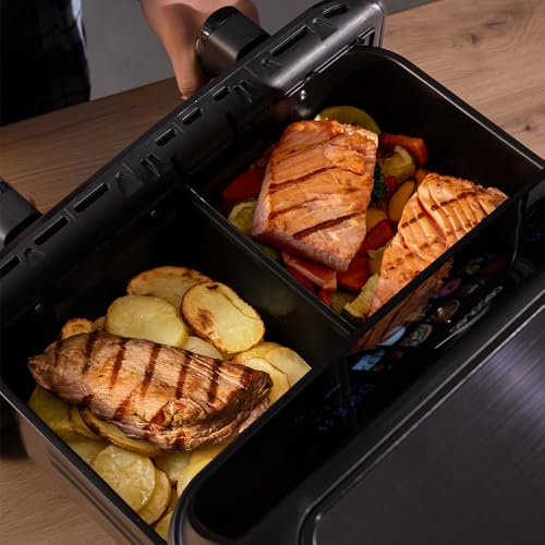 La flessibilità è massima: si può dividere il cestello a metà, creando due zone da 5 litri ciascuna, oppure in una configurazione 1/3 e 2/3 (circa 4 e 6 litri). Immagina di preparare delle patatine fritte in uno scomparto e del salmone alla griglia nell'altro, e averli pronti esattamente nello stesso momento grazie alla funzione Sync. Se invece devi cucinare una grande quantità dello stesso cibo, puoi usare la funzione Match per impostare temperatura e tempo identici per entrambi i lati.