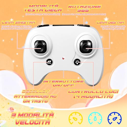 Un'altra caratteristica fondamentale per i principianti è il mantenimento dell'altitudine (Altitude Hold). Una volta raggiunta una certa quota, il drone rimane stabile in aria senza bisogno di continue correzioni sull'acceleratore. Questo permette al piccolo pilota di concentrarsi sulla direzione, rendendo la curva di apprendimento molto più rapida e meno frustrante. Sono presenti anche tre livelli di velocità, perfetti per iniziare con calma e aumentare la sfida man mano che si acquisisce confidenza.