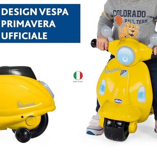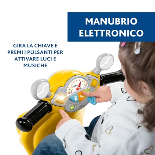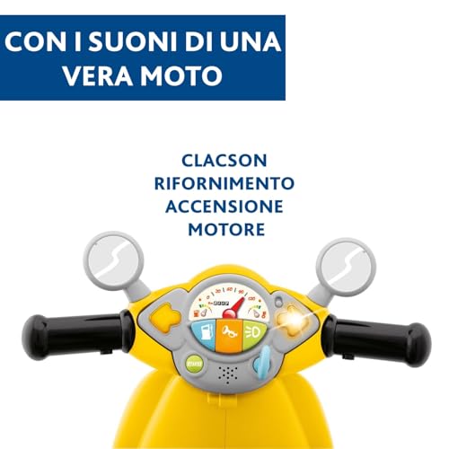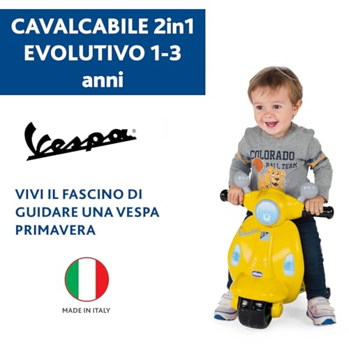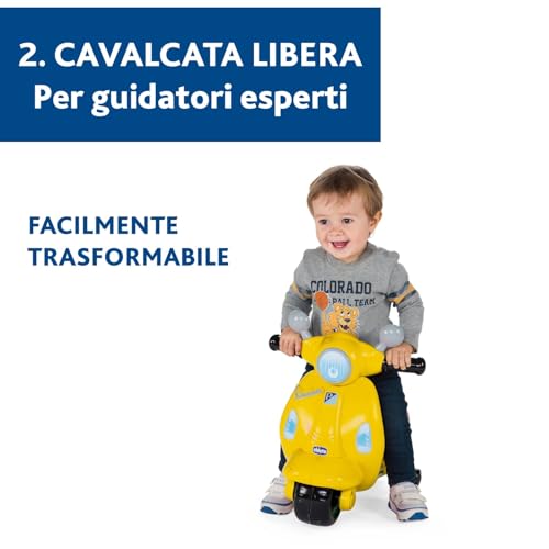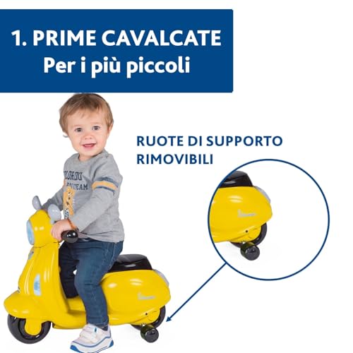 - Modalità "Guida Libera": una volta che il bambino ha acquisito maggiore equilibrio e sicurezza (solitamente intorno ai 18 mesi), le rotelle possono essere rimosse. La Vespa si trasforma così in un vero e proprio cavalcabile a due ruote, aiutando a sviluppare ulteriormente l'equilibrio e la coordinazione.