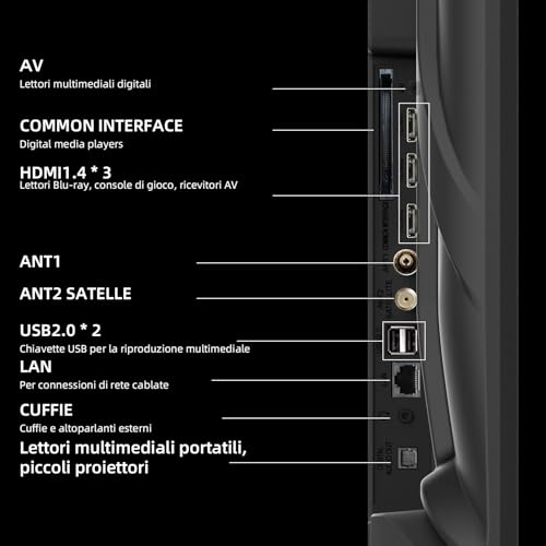 La dotazione di porte e connessioni è completa. Troviamo diverse porte HDMI (con supporto ARC per collegare facilmente sistemi audio esterni), porte USB per la riproduzione di file multimediali, un'uscita audio ottica e l'ingresso Ethernet per una connessione di rete cablata. La connettività wireless è garantita dal Wi-Fi 5G (dual-band su molti modelli) per uno streaming stabile e veloce, e dal Bluetooth 5.0, utile per collegare cuffie, speaker o altri dispositivi senza fili.