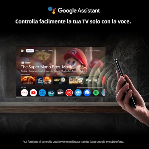 Un'altra funzione chiave è l'Assistente Google integrato, che permette di controllare il televisore e altri dispositivi smart compatibili semplicemente con la voce. Cambiare canale, cercare un film o chiedere le previsioni del tempo diventa un'operazione immediata. Inoltre, la presenza del Chromecast integrato consente di trasmettere con estrema facilità contenuti da smartphone, tablet o PC direttamente sullo schermo del TV.