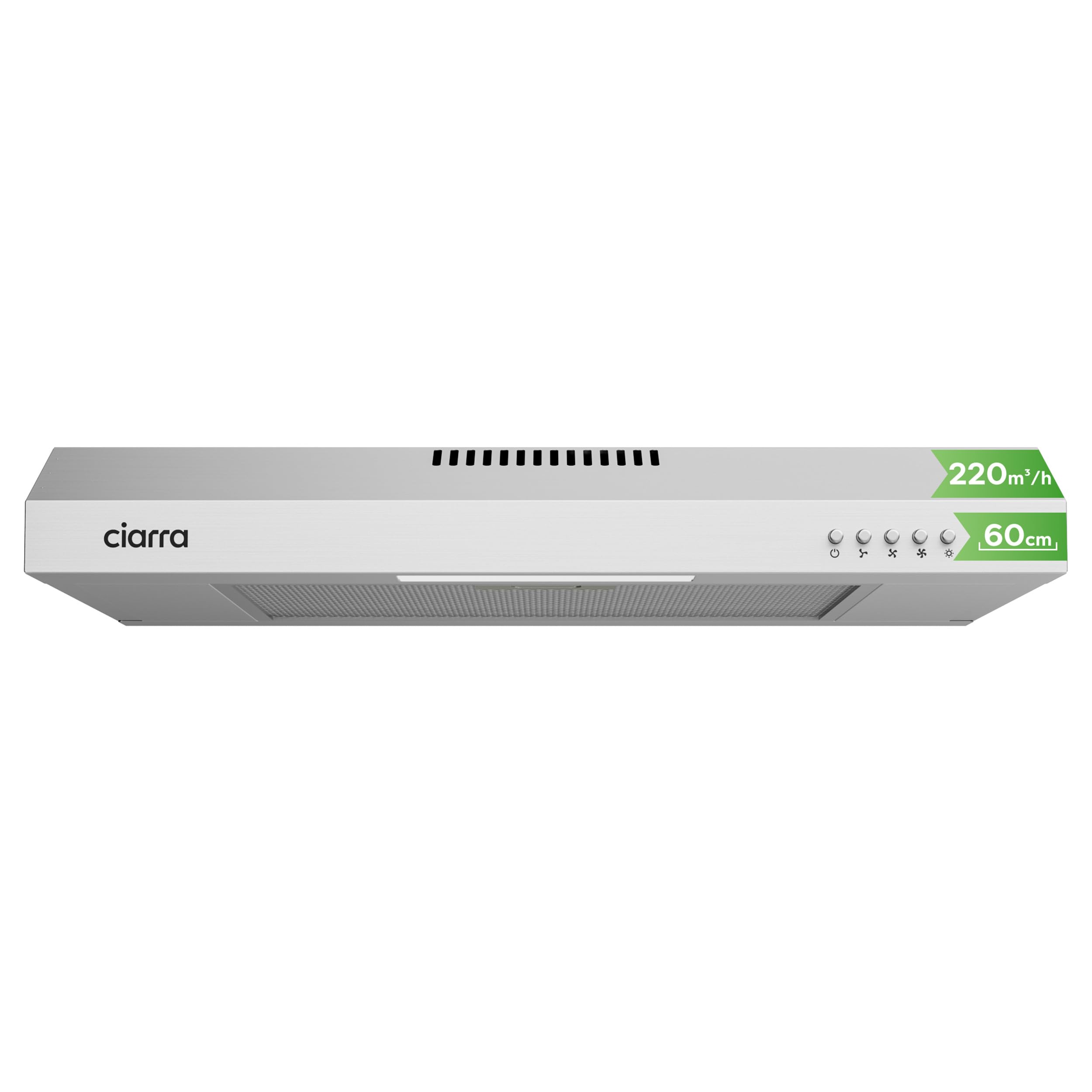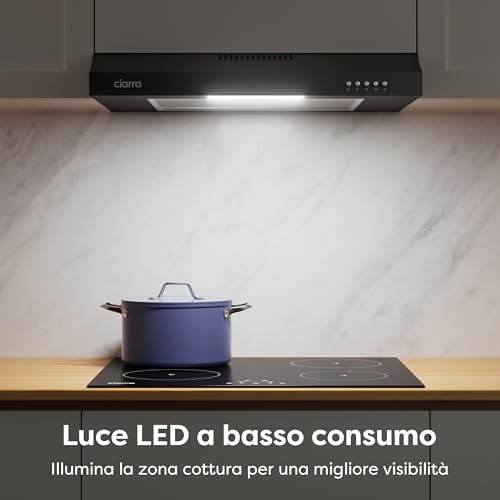 La cappa aspirante sottopensile da 60 cm di CIARRA si presenta con un design semplice e pulito, pensato per integrarsi senza troppi fronzoli nella maggior parte delle cucine moderne. Le varianti di colore, che solitamente includono il classico bianco, il nero opaco e l'acciaio inox, permettono una buona versatilità di abbinamento con i mobili esistenti. Al primo contatto, i materiali appaiono adeguati alla fascia di prezzo: non aspettatevi finiture di lusso, ma la lamiera è robusta quanto basta e i comandi, solitamente a pulsante, sono intuitivi e facili da raggiungere.